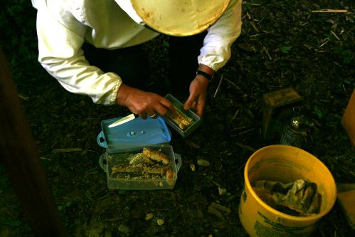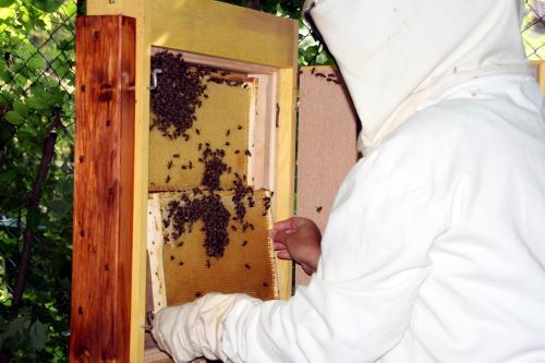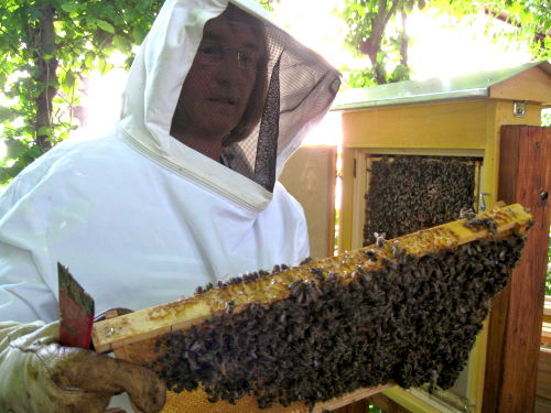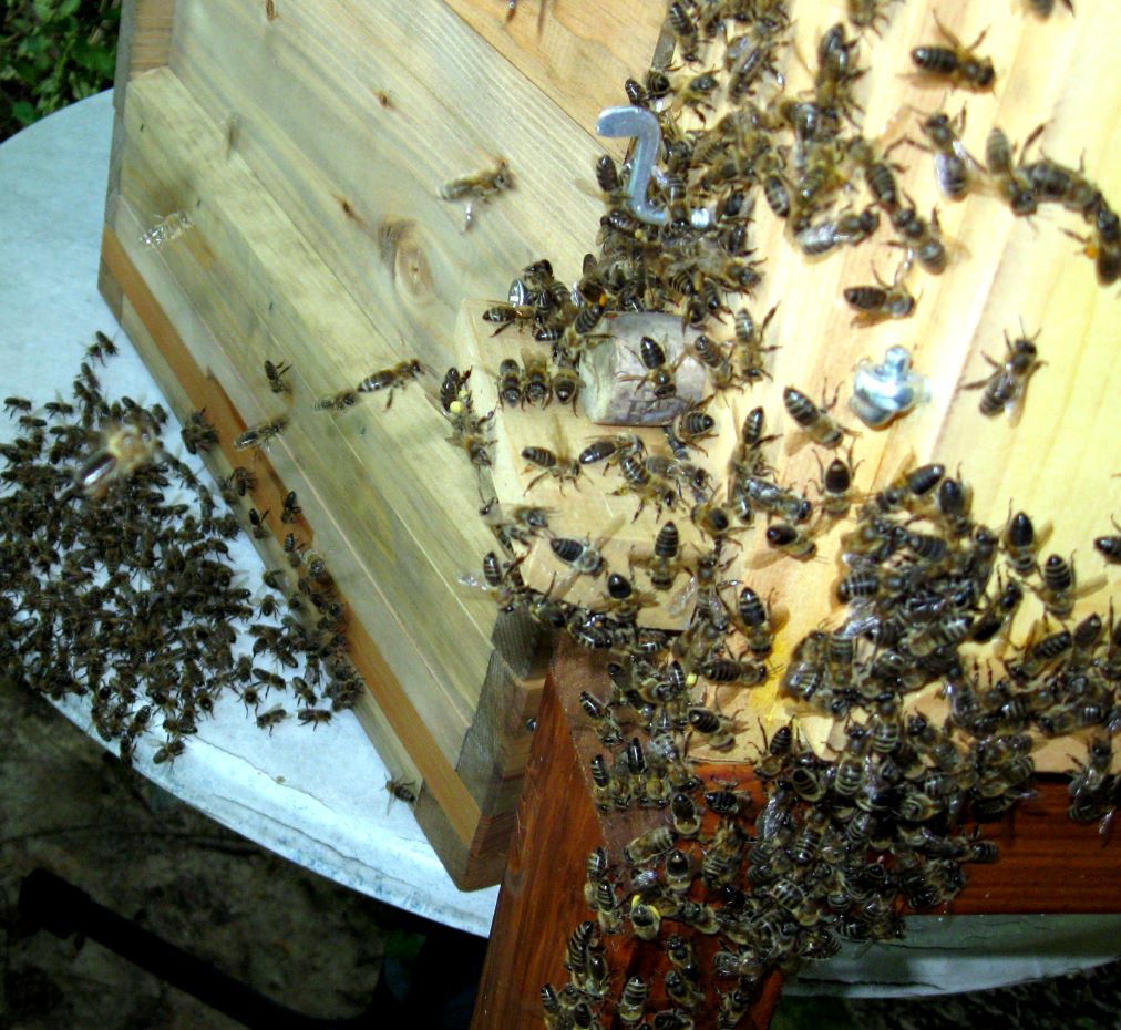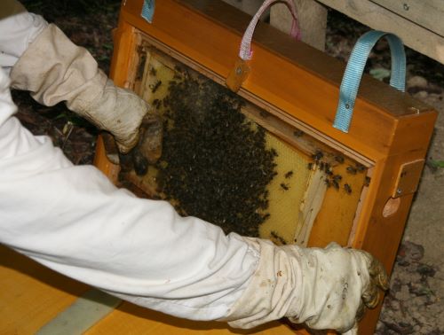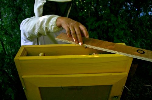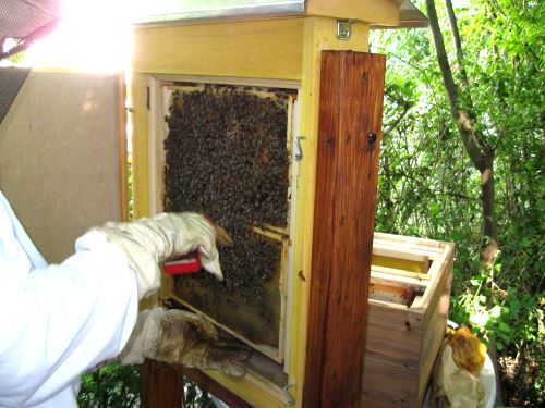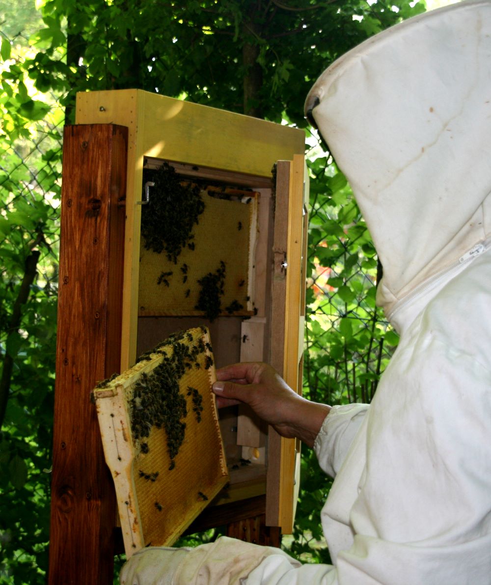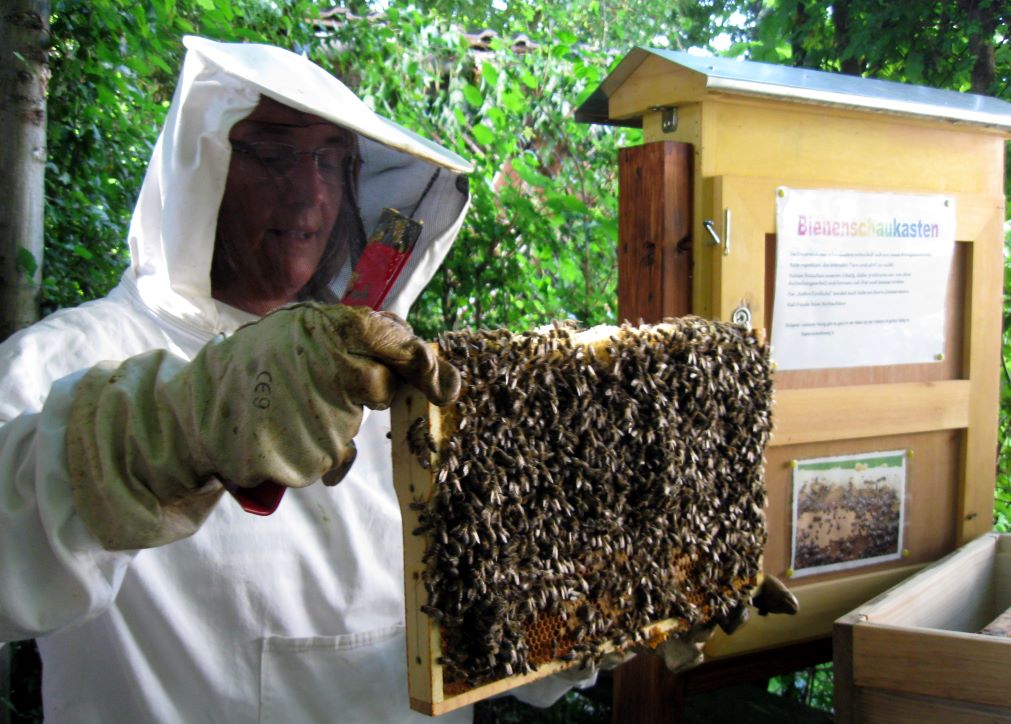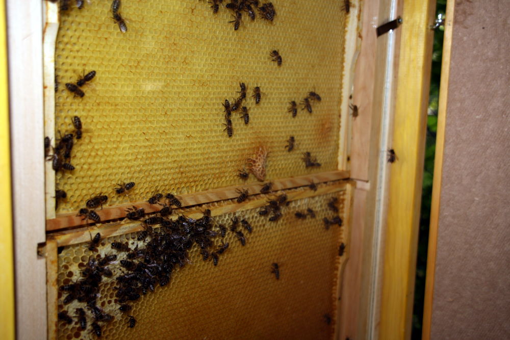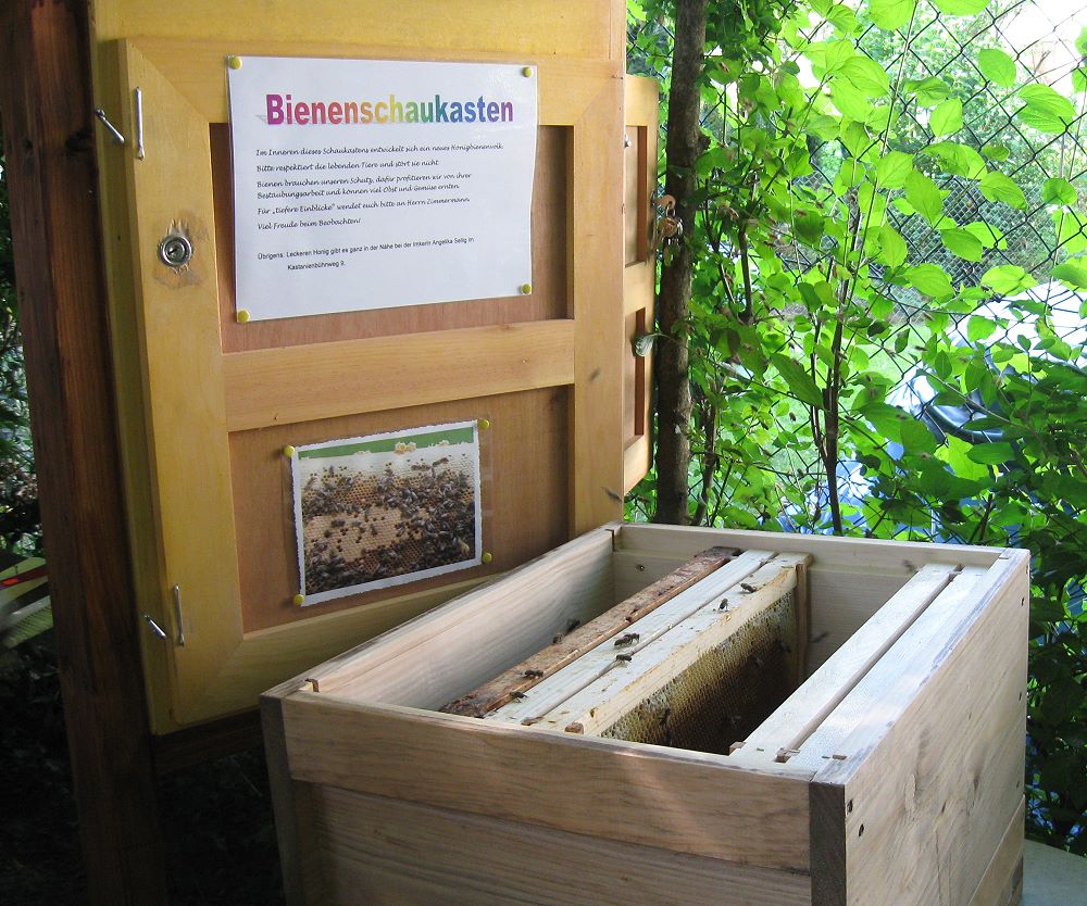 Am 14. Mai 2012 wurde unser Schaukasten erstmalig bestückt. Frau Angelika Sellig, Biologin und Imkerin, hatte sich dazu bereit erklärt. Wir - Kinder der Garten-AG - hatten sie vor einem Jahr besucht und sie erklärte uns einige Zusammenhänge (LINK). Doch zunächst müssen sich die Bienen an den neuen Kasten gewöhnen. Erst dann können wir nach und nach die Bienen bei dem Bau ihre Waben zusschauen. |