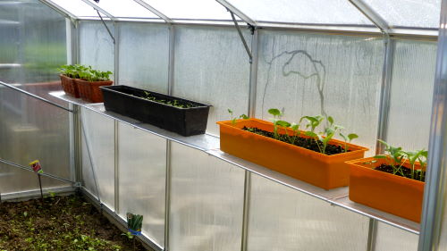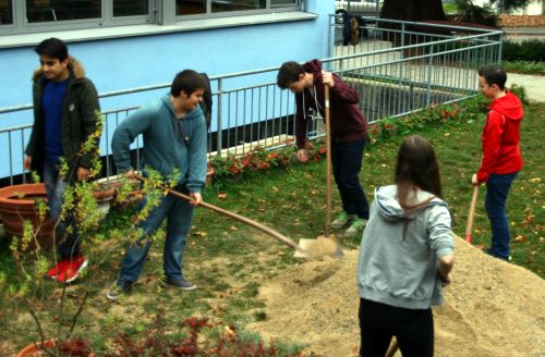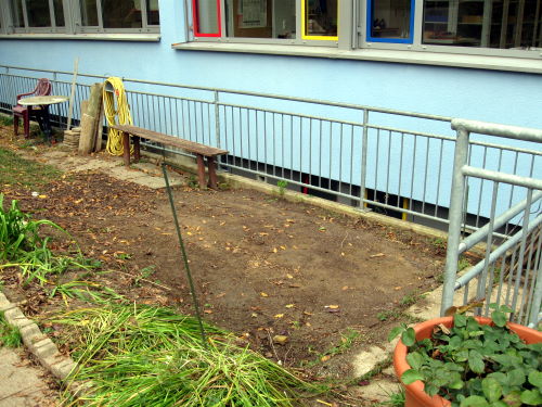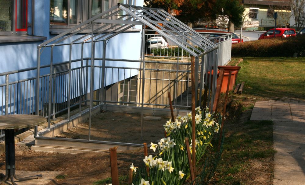 | Die weiße Folie hielt nur ein Jahr. Das Preisgeld des Schulgartenwettbewerbs wurde für die drei Plexiglasplatten für das Dach ausgegeben. Die Seitenwände wurden durch grüne Gitterfolie ersetzt. | ||||||||||||||||||