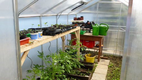 oder auch Windschutz Der Schulgarten verfügt nun auch über einen geschützten Bereich für nicht winterharte Pflanzen - Gewürzpflanzen, für die frühe Aussaat und zum Schutz der Tomaten vor der Kraut- und Knollenfäule Mit 2 x 3 m Dachfläche wird Regenwasser aufgefangen. |