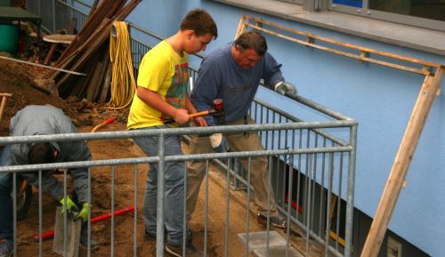 | Nach 10 Jahren bezahlte uns der Förderverein ein neues Gewächshaus. Dieses wird durch eine Klasse der WRS mit Herrn Fischer bewerkstelligt. Abriss des alten, Fundament und Bau des neues Häuschens. Als Paket kam es schon an.