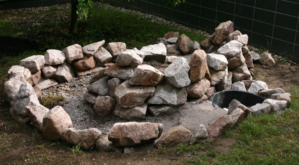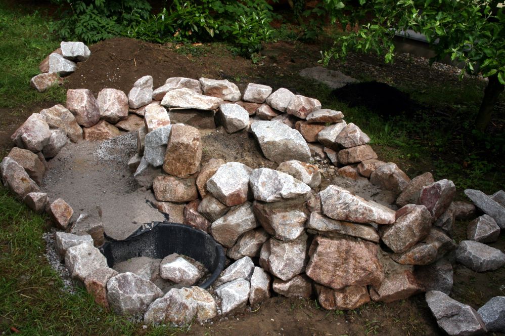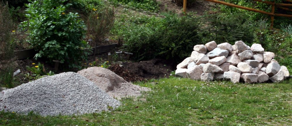 Nach der Entscheidung besorgte ich die Materialien. Bei einer einer Anfrage an den Bauhof der Stadt wurde ich auf ein Granitsteinwerk verwiesen. Und dort konnte ich alles was wir brauchten erhalten. Findlinge aus Seebacher Granit ( 2 Tonnen) , Sand und Kies, insgesamt sieben Touren mit dem PKW-Anhänger.