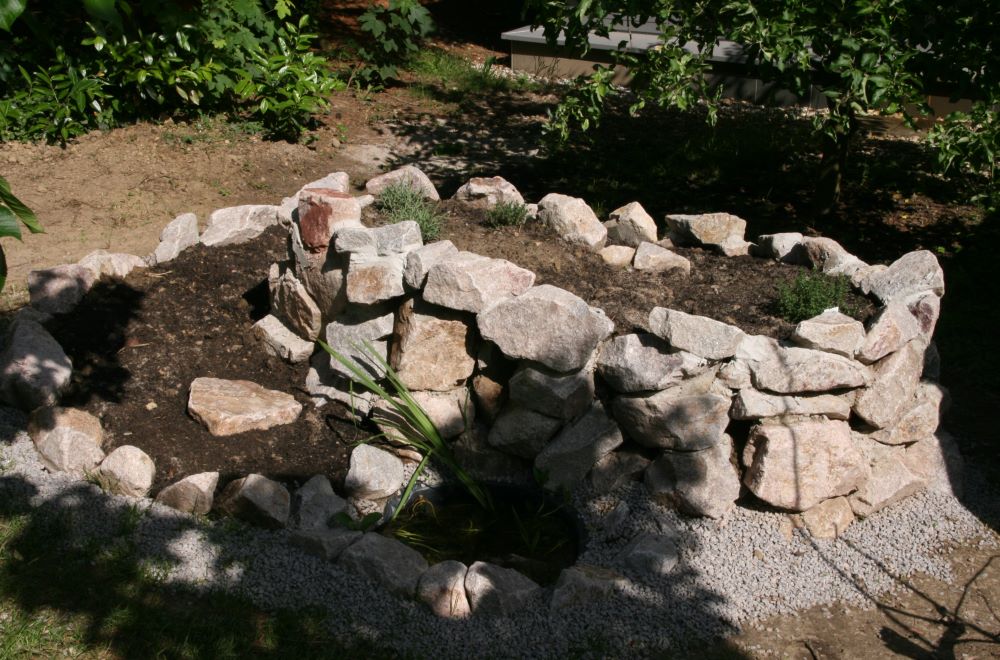| Zu Beginn konnten einige Schüler dabei helfen, die Steine auszulegen. Sehr bald wurde klar, dass die Größe aufgrund der Steindicke verändert werden musste. Als die Grundstruktur mit Steinen lag, das Teichbecken (Kübel) eingebaut war, konnte ich die Spirale fertigstellen, die oberen Steine sind mit Zementmörtel befestigt. Hohlräume entstanden in der Spiralmitte (Bauschutt) und ein kleines Holzkästchen wurde an einer Seite eingebaut. | ||||
