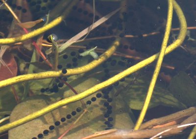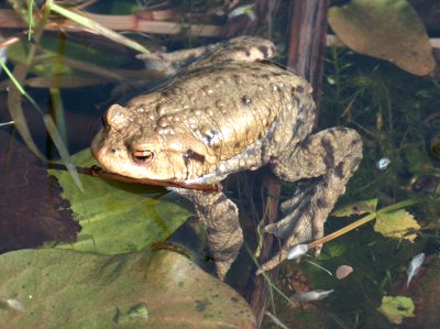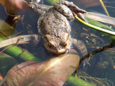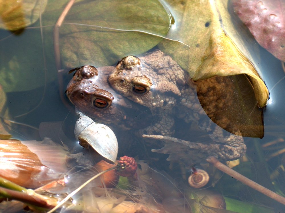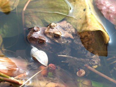 Kaum wurden die Tage wärmer und das dicke Eis im Teich schmolz dahin entdeckten wir die ersten Erdkröten. Innerhalb zweier Wochen nach der Kälte quakte es vernehmlich und die Kröten ließen sich auch kaum durch Beobachter auf der Suche nach Weibchen stören. Und schon waren die ersten Leichschnüre zu entdecken. Allerdings quakte es auch vor Kellerfenstern - so konnten wir 4 Kröten und noch zwei Molche in den Teich befördern.