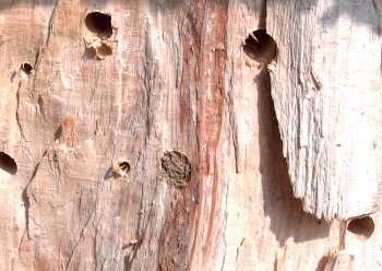 | Am Montag, den 4. April, beobachteten wir während der Garten-AG mit Viertklässlern die ersten Wildbienen, die summend von Loch zu Loch flogen und auch im neuen Beobachtungskasten verschwanden, um die geeignete Brutstelle zu finden. Sie entschieden sich für älteres Totholz, wie man unschwer an den Bildern erkennen kann. Am folgenden Mittwoch fanden weiteren Schüler geschlossene Löcher vor und mir ist es auch gelungen Fotos zu schießen.