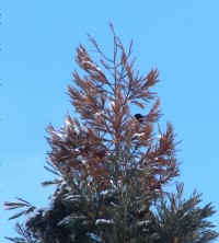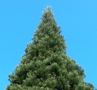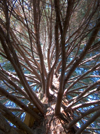 Einen Blick unter die Nadeln des Baumes verrät die Anziehungskraft des Baumes auf unsere dort nachmittags spielende Schüler. Ein kleines Baumhaus wurde da mal errichtet; in der trockenen Zeit 2003 geriet dieser links abgebildete Baum in Brand ( zündelnde Kinder) und die Feuerwehr musste gerufen werden. | ||||||||||