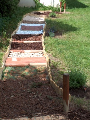 Wenn die Wasserräder eingesetzt sind drehen sie sich. Das Wasser im Ablauf lässt sich stauen und daran Unterrichtsthemen festmachen. "Grünes Klassenzimmer" - auf fest installierte Bänke haben wir nun verzichtet - die Nachbarn aber auch wir haben Angst, dass sich nachts ein Grillplatz daraus entwickeln könnte. Aber mit leicht aufstellbaren Klappbänken kann eine Klasse auch im Schulgarten verweilen. Auch ist unser Fühlpfad fertiggestellt, wobei daran je nach Jahreszeit auch Veränderungen vorgenommen werden können. Ebenso lassen sich noch viele Pflanzen - auch am neuen Teich - einpflanzen. |