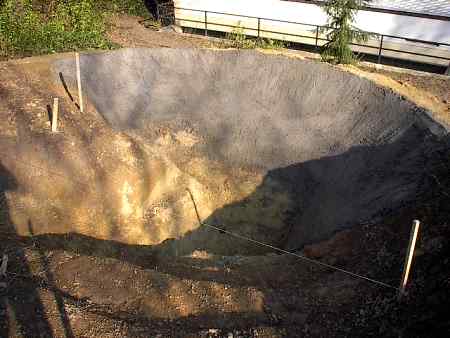 Nach Aushub des ca. 6 x 6 Meter großen Teichs auf einem Schräggelände,